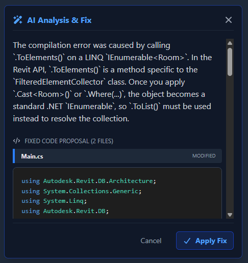 Paracore includes a built-in AI assistant designed to help you debug Revit API scripts in seconds. This feature, known as Explain & Fix, uses an LLM (Large Language Model) to analyze execution errors and suggest immediate code corrections.