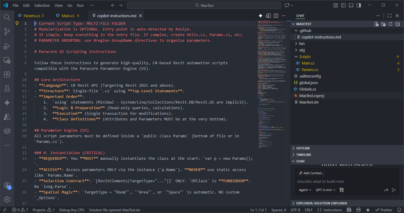 Paracore is designed to work seamlessly with modern AI coding assistants. Instead of a limited built-in AI mode, Paracore leverages the full power of VS Code extensions. This allows you to choose the model and tool that best fits your workflow.