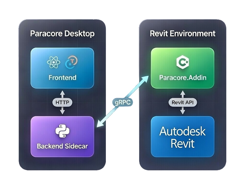 - Paracore Revit Addin: The execution host that lives inside Revit, providing the direct API context and execution engine.